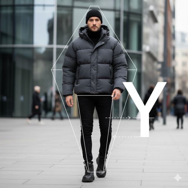 これは、ボリュームのあるアウター(Yの上部)に対して、ボトムスは黒のスキニーパンツのような細身のもの(Yの下部)を合わせるテクニックです。