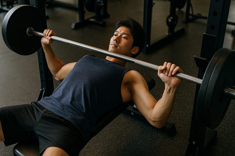 また、自分が苦手とする動作(バーベルを胸から離す瞬間が弱い、腕を伸ばし切るのが弱いなど)を分析し、補助種目を取り入れて弱点を補強します。