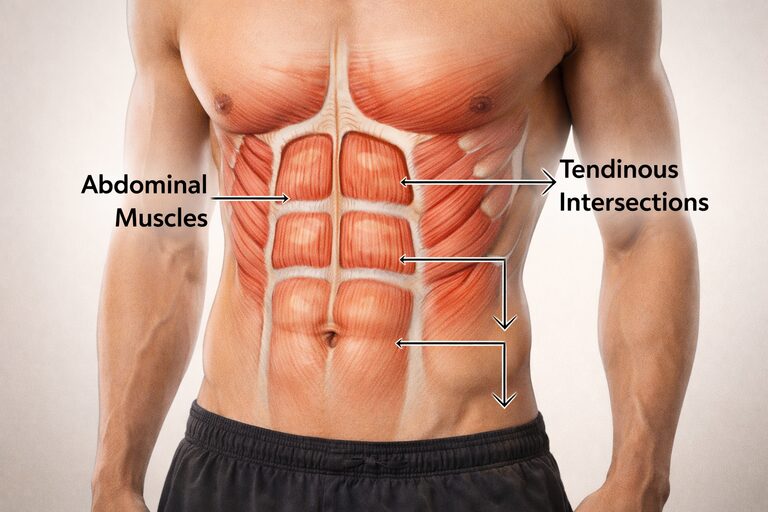 腹筋が6つや8つに割れて見えるのは、腹直筋の上に「腱画」という帯状の組織が横切っているからです。