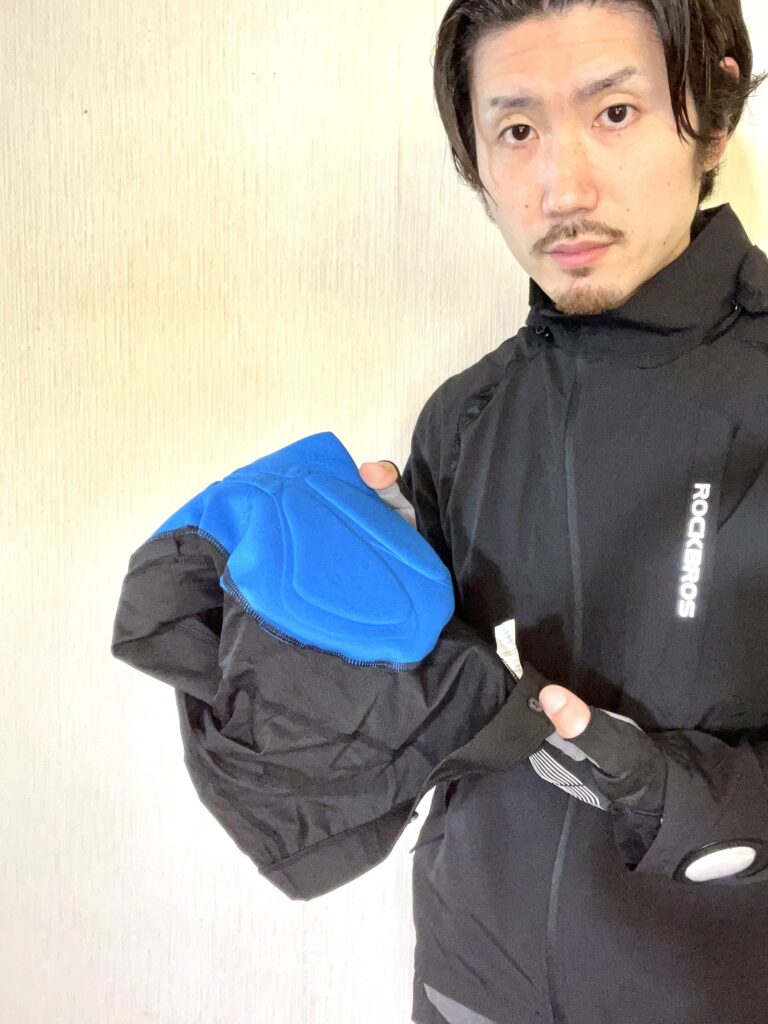 見た目は普通ですが、パットなしでは30分でお尻が痛くなります。また、パーカーは風をはらんで重くなり、股周りのゆとりがサドルに引っかかる危険もあります。